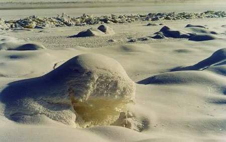 江上陈列着许多天然的艺术品,它们都是冰与浪、风与雪共同创造的杰作。那波状起伏的冰坝冰柱,诉说着它曾经拥有的急流澎湃。